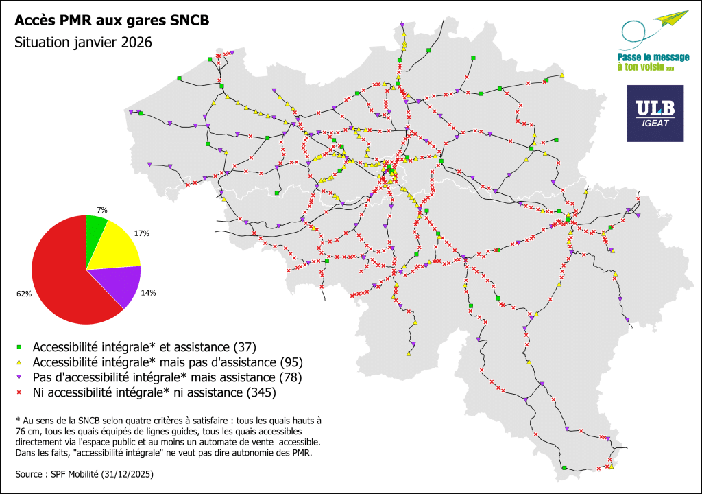 Chaque année, nous éditons des cartes sur l’accessibilité des gares de la SNCB en Belgique. La diffusion de ces cartes est nécessaire car elle nous permet de suivre la situation et d’illustrer l’évolution concrètement. Ce travail a été réalisé en étroite collaboration avec l’ULB-IGEAT, grâce aux données fournies par la SNCB.